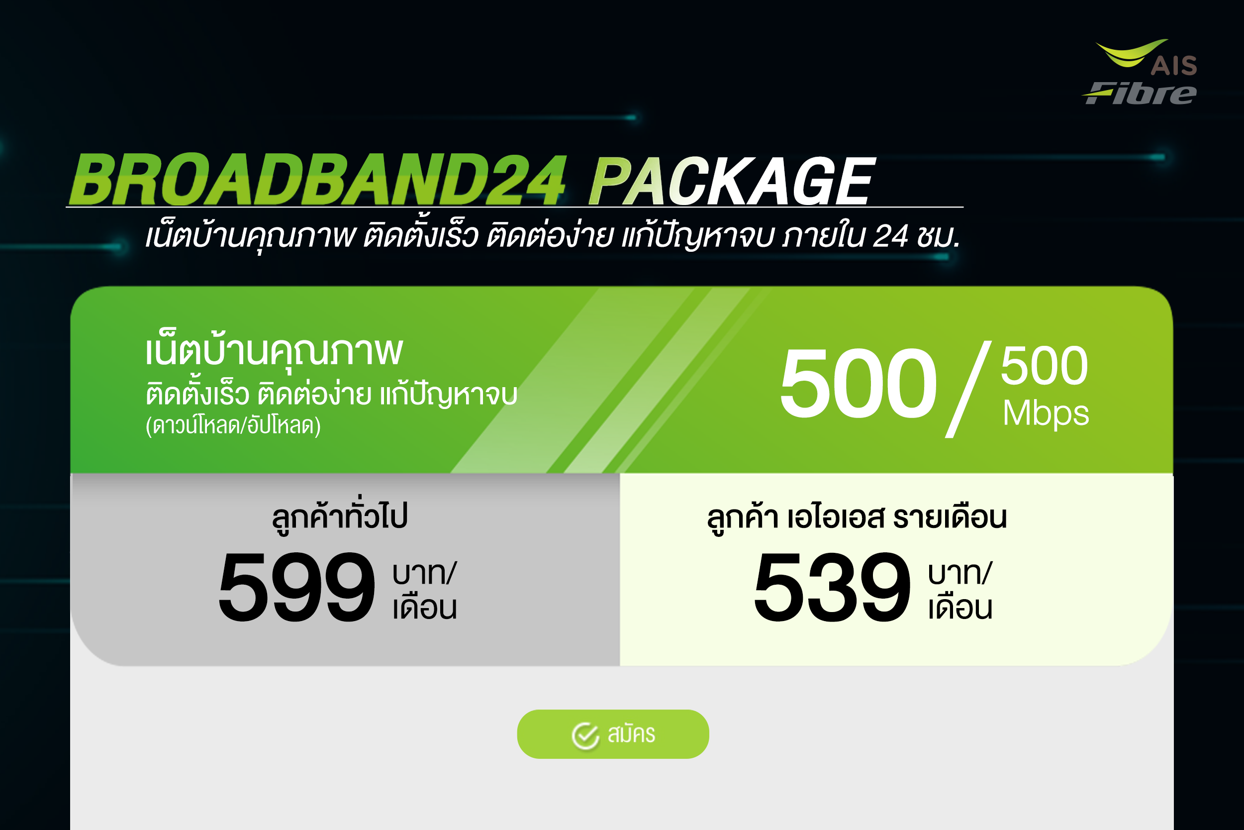 ข้อเสนอปังขนาดนี้ ไม่เปลี่ยนมาใช้ เน็ตบ้าน AIS Fibre ก็ไม่รู้จะว่ายังไงแล้ว สมัครได้แล้ววันนี้ที่ https://m.ais.co.th/KYH1KARCx
