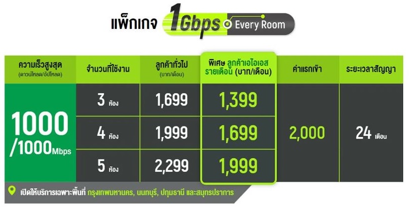"AIS Fibre ได้มีการแก้ปัญหาที่จุดเจริญที่ขาดการครอบคลุม WiFi ในบางจุดภายในบ้าน และยังให้บริการกับลูกค้าที่ต้องการสัญญาณที่เร็ว มั่นคงและมีคุณภาพด้วยประสิทธิภาพที่ดีที่สุด" บริการ 1Gbps Every Room ได้เริ่มเปิดให้บริการในกรุงเทพมหานครแล้ว โดยมีแพ็คเกจเริ่มต้นที่ 1,399 บาทต่อเดือนสำหรับ 3 ห้อง รวมถึงแพ็คเกจอื่น ๆ ที่สามารถรองรับได้ถึง 8 ห้อง