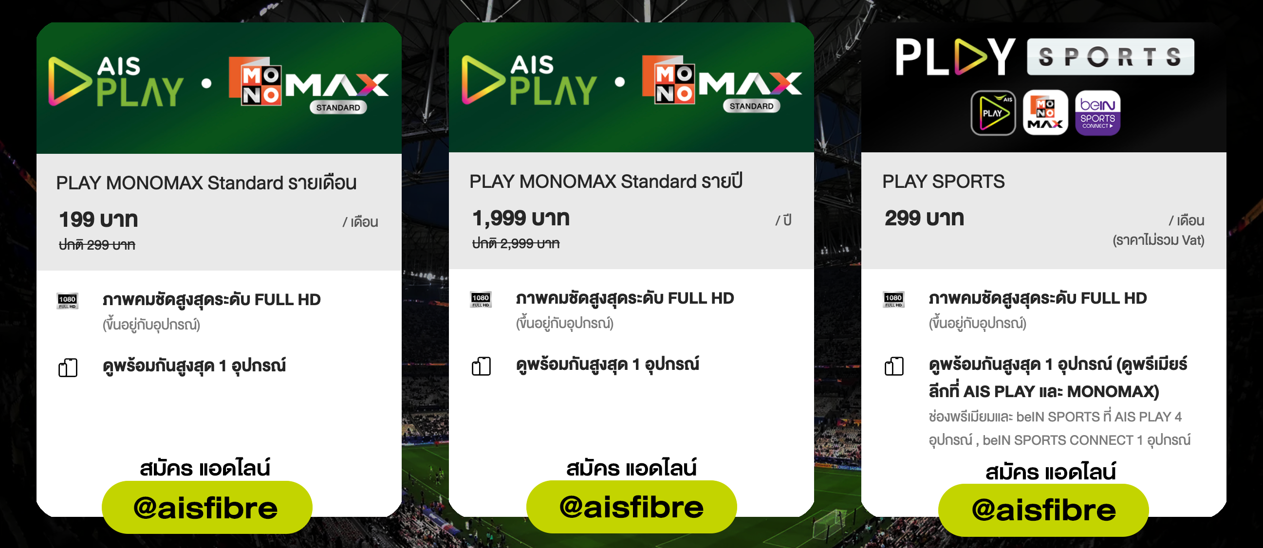 ลูกค้า AIS ระบบรายเดือน ระบบเติมเงิน และเอไอเอส ไฟเบอร์ทรี สามารถรับข้อเสนอพิเศษจาก PLAY MONOMAX Standard ดังนี้