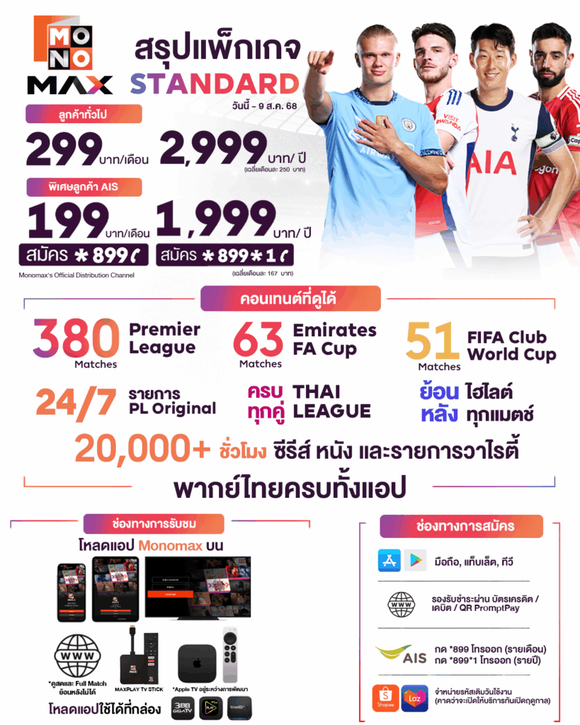 สำหรับลูกค้า AIS เปิดราคาแพ็กเกจ “MONOMAX Standard” ในราคาพิเศษที่คุ้มที่สุดเท่าที่เคยมีมาประกอบด้วย